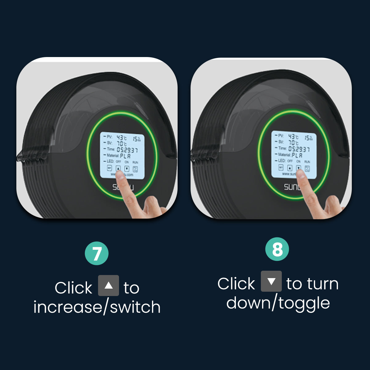 SUNLU Filadryer S2 has 4.6 inches LCD touch screen. You can easily see all settings like Heating Temp,Time, dryer Filament Type and LED Light. All settings just need one click. -