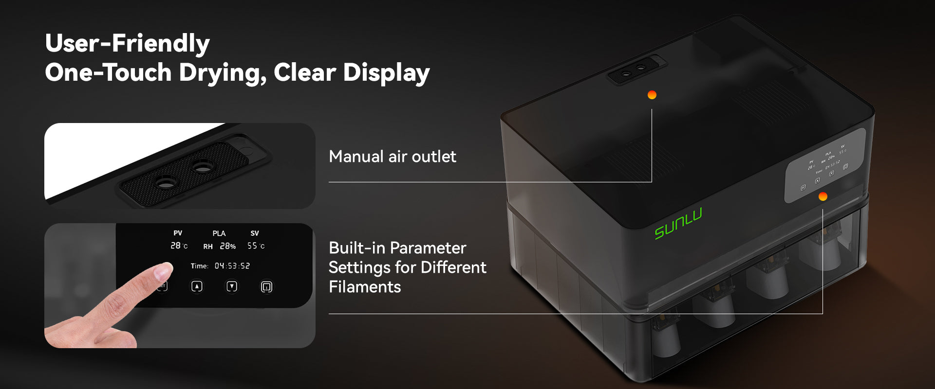 Unique Air Duct Design. The innovative airflow system directs heat to circulate precisely around the filament area, ensuring efficient drying while protecting the AMS feeding motor from high temperatures. This design may also cause slight temperature and humidity differences between electronic components.