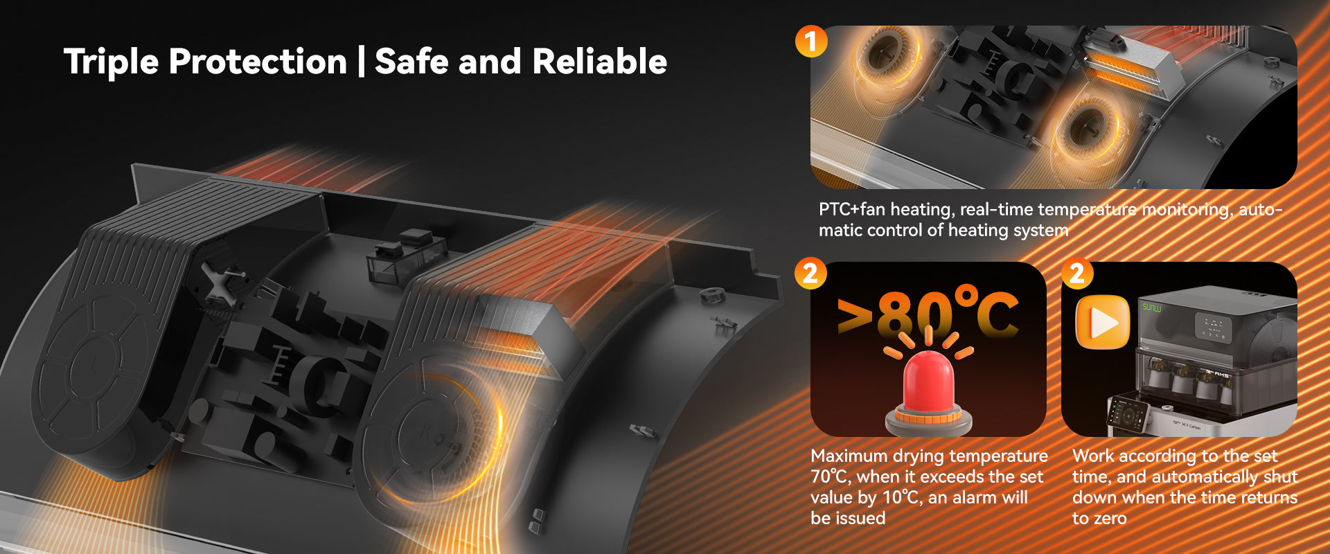PTC heating. Dual-level protection with a temperature control switch. Software-based intelligent temperature control, real-time temperature monitoring, and automatic control of the heating system. Maximum drying temperature of 70°C. Alarms are triggered when the temperature exceeds the set value by 10°C, when the temperature fails to rise, or when the fan malfunctions. The device operates according to the set time and automatically shuts down when the time reaches zero.