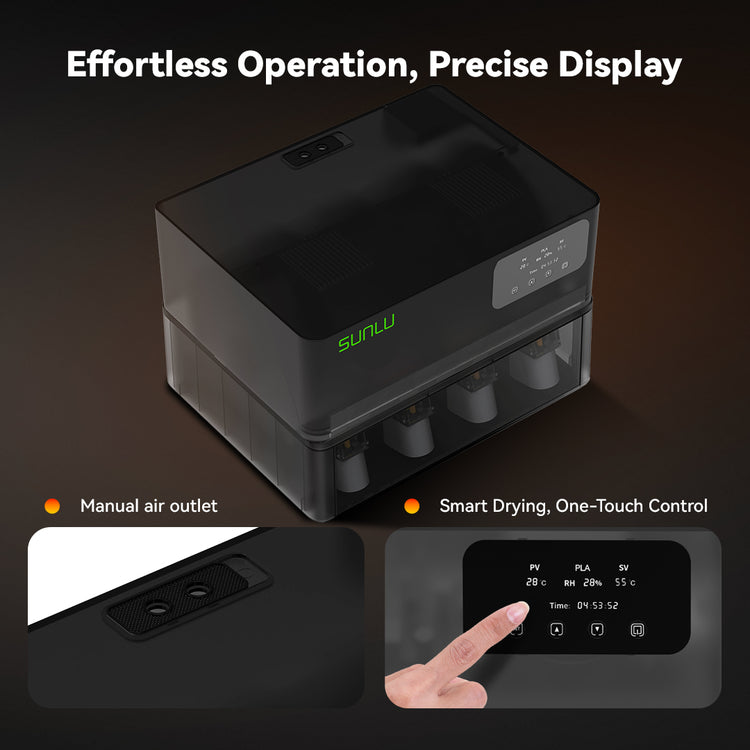 - Do not touch the heater or fan inside the box during the working process of this product to avoid burns. When drying filaments, the top cover of the drying box should be covered to avoid heat dissipation. Avoid moving this product during normal operation to prevent burns caused by the high temperature of the outer surface.