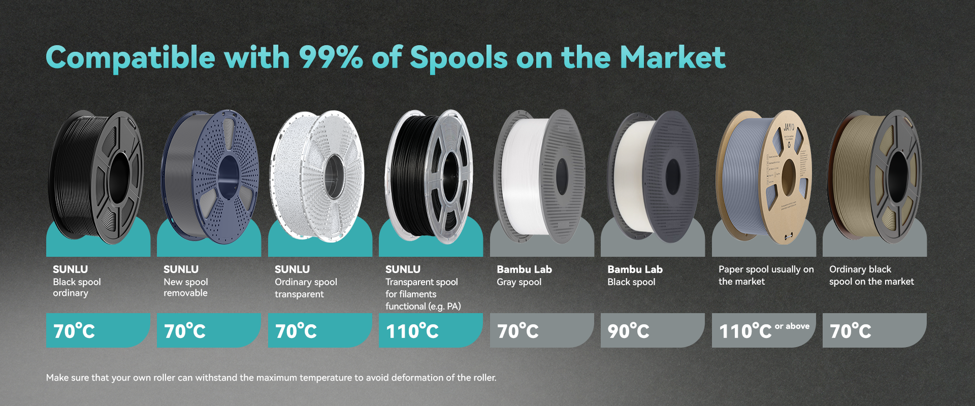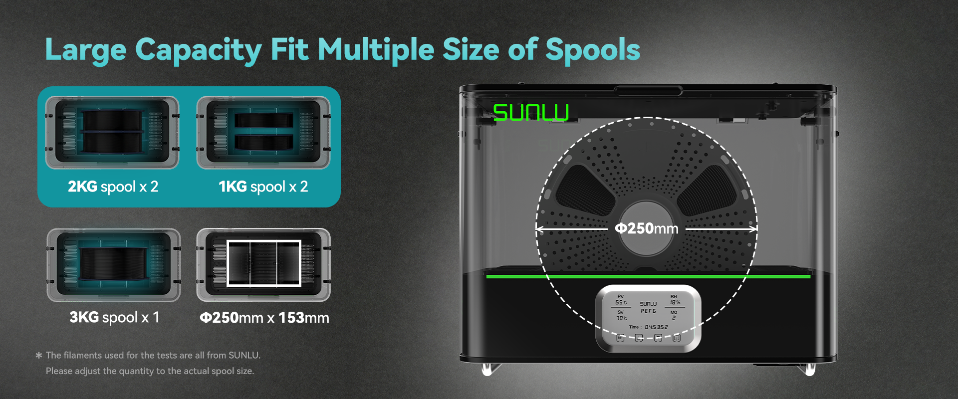 The maximum size: of the spool that can be accommodated(take SUNLU's spools for example) Φ250mm*153mm (1KG×2 or 2KG×2 or 3KG×1)