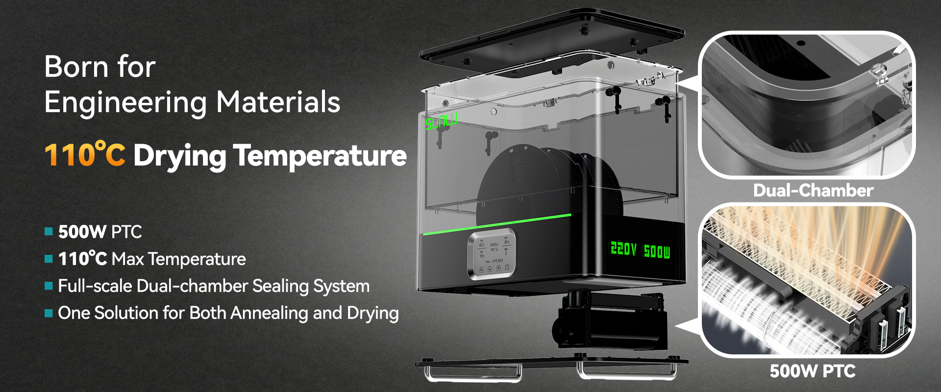[Fast and Efficient Drying] 500W PTC ultra-high heating power makes your creation a step faster. It takes only 20 minutes to heat up to 50℃ at room temperature and 30 minutes to heat up to 70℃! Temperature can reach up to 110℃ (high temperature drying needs to take into account the temperature resistance of the filament spool)