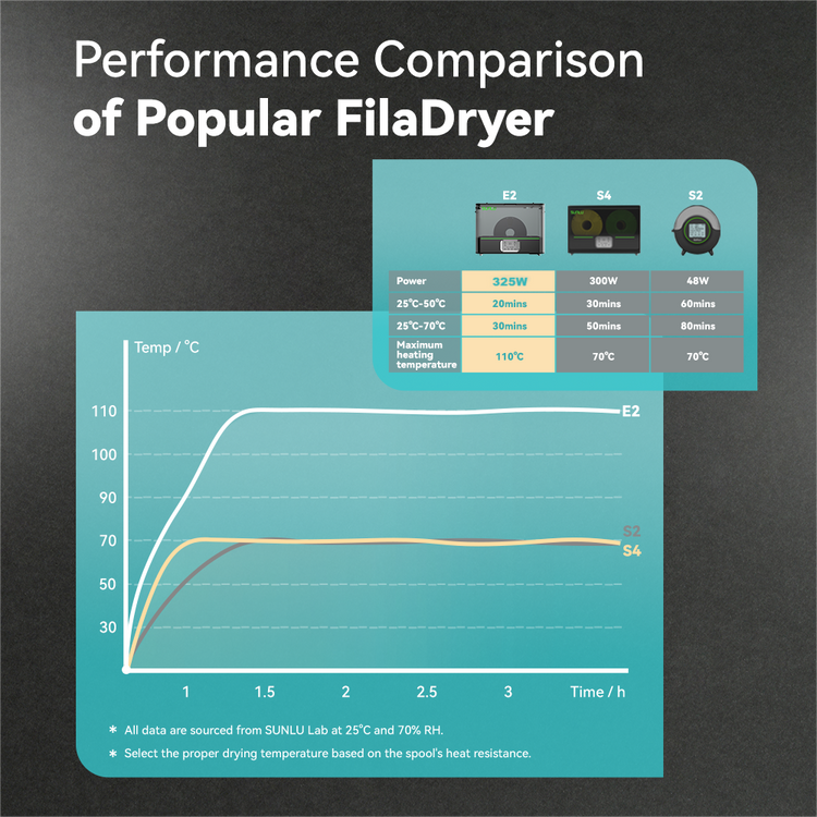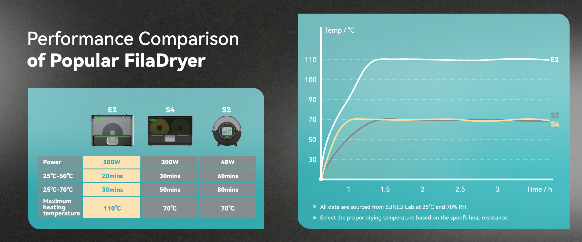 1. The maximum heating temperature of SUNLU FilaDryer E2 is up to 110 ℃, please carefully observe the current set parameters (such as filament type, heating temperature) is consistent with the actual need to dry the filament, to avoid too high a temperature leading to deformation of the filament (filament drying temperature, recommended product manuals or this product page of the filament spool data)