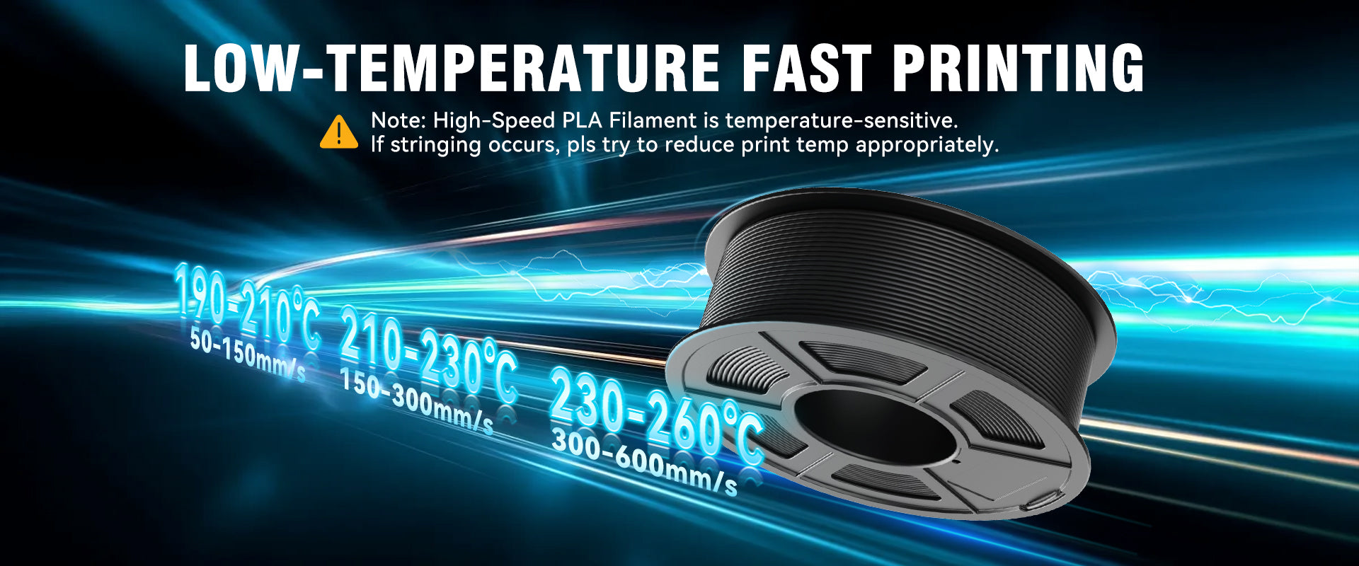0~100mm/s normal speed print quality is better than PLA, the surface is smoother, the overhang performance is better, the overhang angle is less than 70° can not be added support, greatly saving printing time and material waste. Low-temperature fast printing, save time, more energy saving.