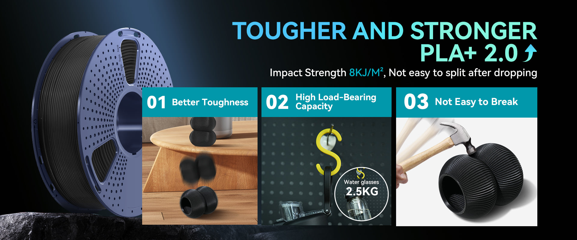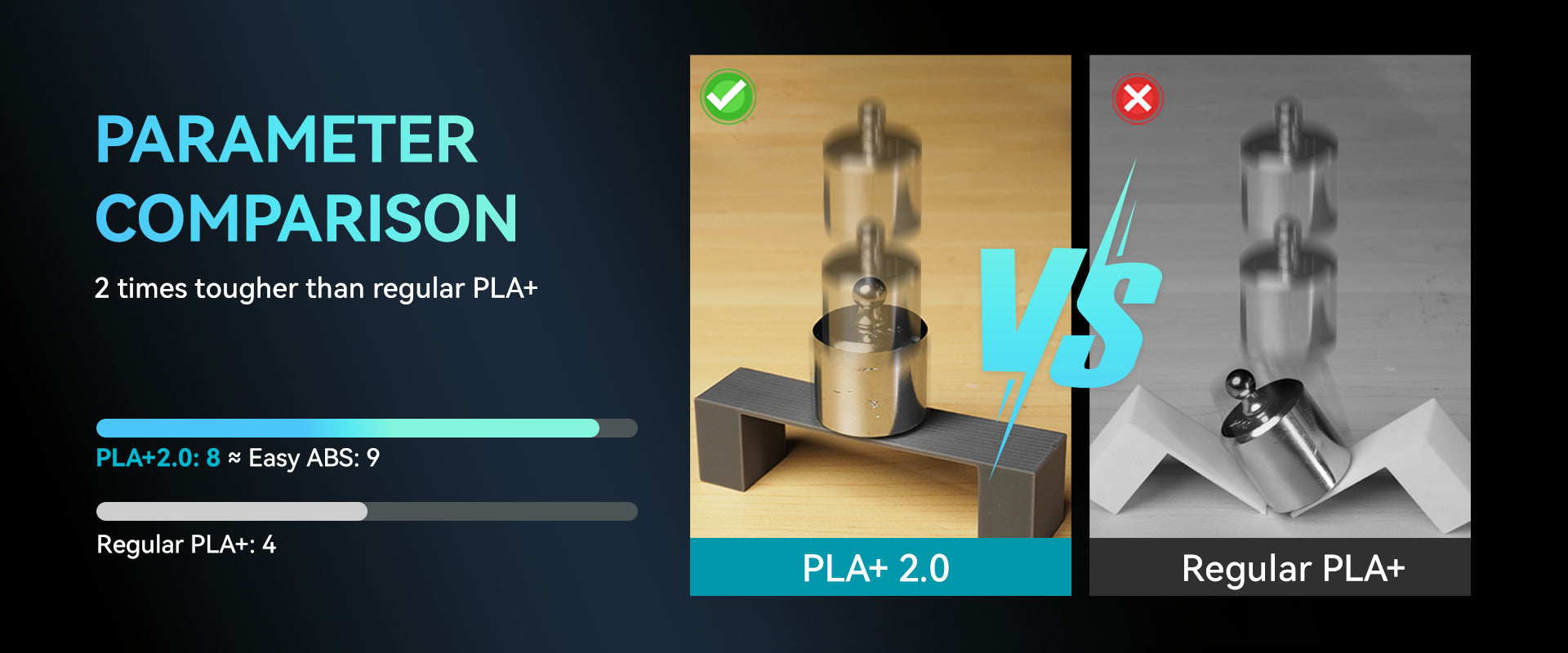 Comparable Strength to Easy ABS, Excellent Durability. With strength levels close to Easy ABS, PLA+2.0 is designed to be shatter-resistant and durable. This makes it an ideal choice for applications requiring robustness and longevity.
