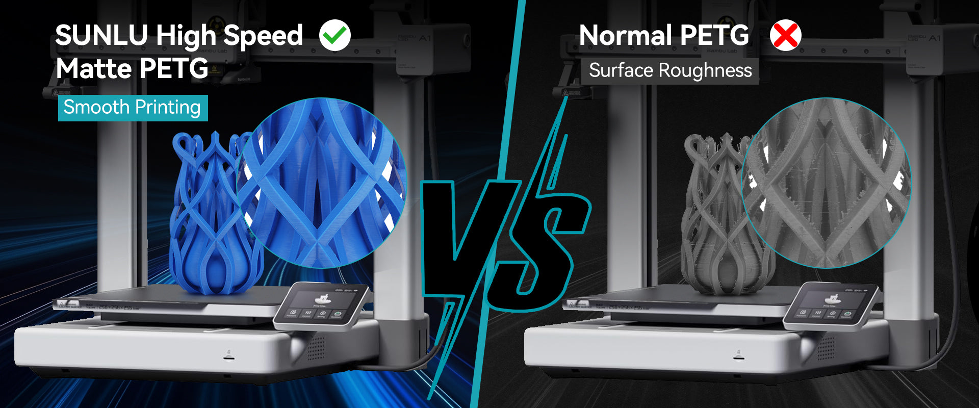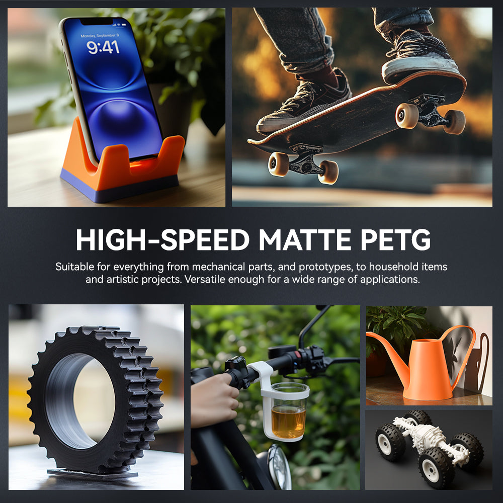 Compared with standard PETG, High-Speed Matte PETG offers both high-speed printing compatibility and a matte surface finish. Its melt flowability is significantly improved, allowing for higher printing speeds.However, please note: due to the increased flowability, moisture absorption will more easily lead to stringing, oozing, and other issues during printing, which may affect print quality.