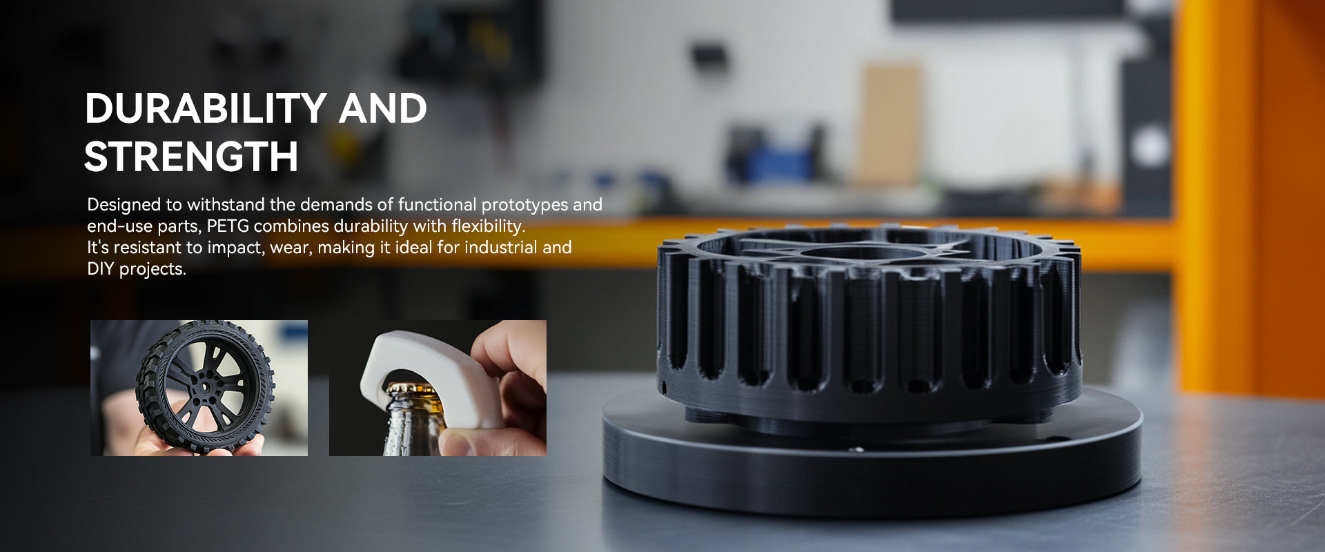 Designed to withstand the demands of functional prototypes and end-use parts, PETG combines durability with flexibility. It's resistant to impact, wear, and various chemicals, making it ideal for industrial, mechanical, and DIY projects.