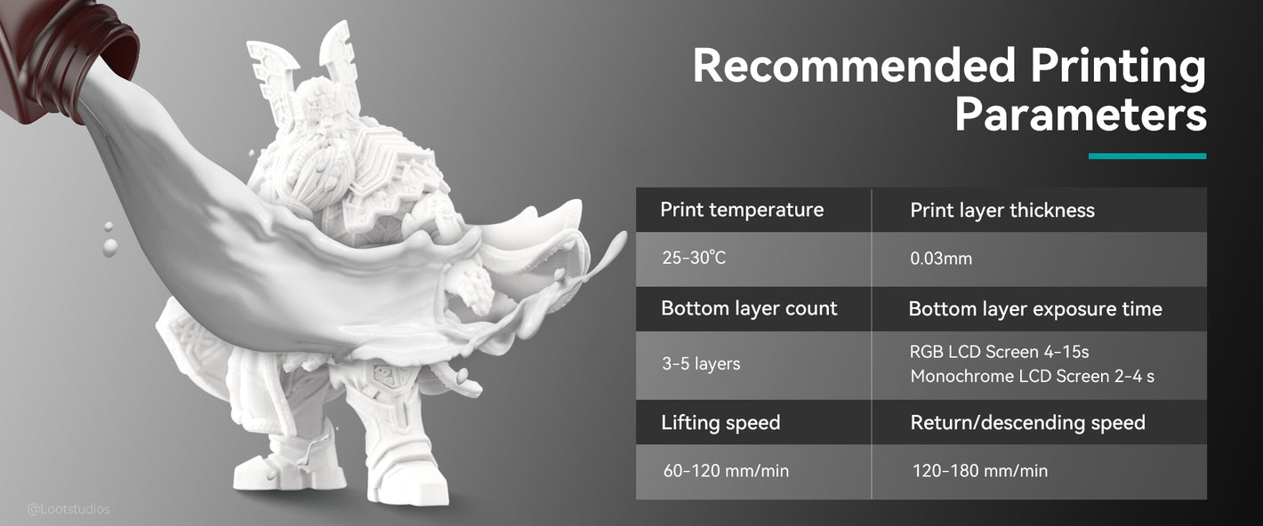 1. Temperature Range: Optimal printing temperature is between 18-35℃. If it's too cold, preheat the resin (do not exceed 60℃).