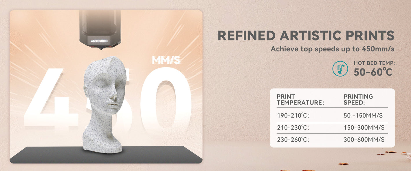 Compatible with various high-speed 3D printers, supporting speeds from 50mm/s to 600mm/s with no stringing or clogging. (Filling speed up to 450mm/s, 600mm/s in case of thin walls)