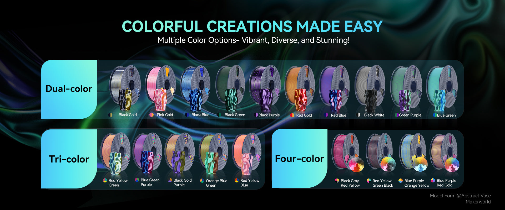 SUNLU Multi Color Silk PLA Plus 3D Printer Filament offers a multi-color printing experience with 1 single filament. Printed creations with varying colors from different angles.