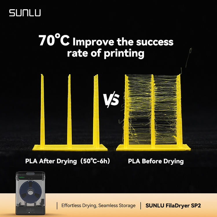 1. The maximum heating temperature of SUNLU Filament Dryer SP2 is up to 70 ℃, please carefully observe the current set parameters (such as filament type, heating temperature) is consistent with the actual need to dry the filament, to avoid too high a temperature leading to deformation of the filament (filament drying temperature, recommended product manuals or this product page of the filament spool data)For example, if the machine is set to operate at ≥70°C, the temperature resistance of the spool of the filament you are using should be ≥70°C to avoid deformation of the spool.