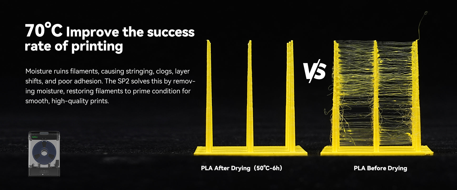 SP2 has superb adaptability to most universal filaments on the market. Its working temperature range: 35°C-70°C. It can be compatible with 99% of general filaments and some functional filaments like: PLA, PLA+, PETG, ABS, TPU, PVA, PVB, ASA, PA/PC etc.