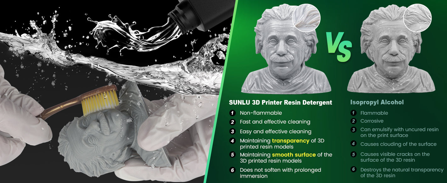 D Photopolymer Resin Specific Cleaner: SUNLU 3D Printer Resin Detergent easily and quickly decompose and absorb residual silicone tools and epoxy resin a, b glue/uv resin. Easy and effective cleaning of uncured UV photopolymer resins from 3D printed parts.