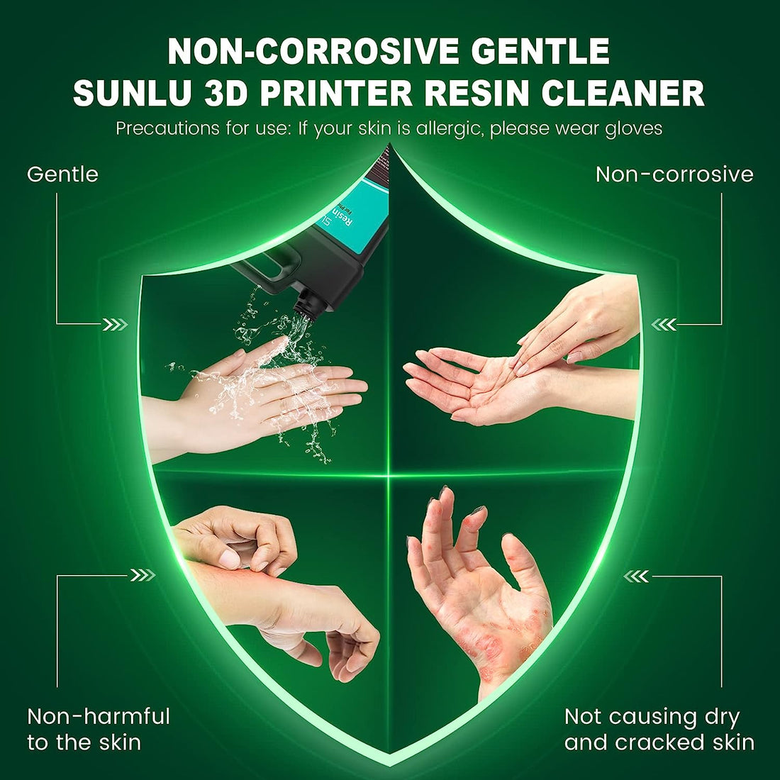 SUNLU Hand-washable 3D Printer Resin Detergent: SUNLU 3D Printer Resin Cleaner is designed for use on uncured 3D printing resins as it changes the chemical structure of 3D resins, making it dissolvable in water. SUNLU 3D Printing Resin Detergrent main ingredient is gentle, non-corrosive and non-invasive to the skin. Will not cause dry and chapped skin and has a light fragrance when cleaning.