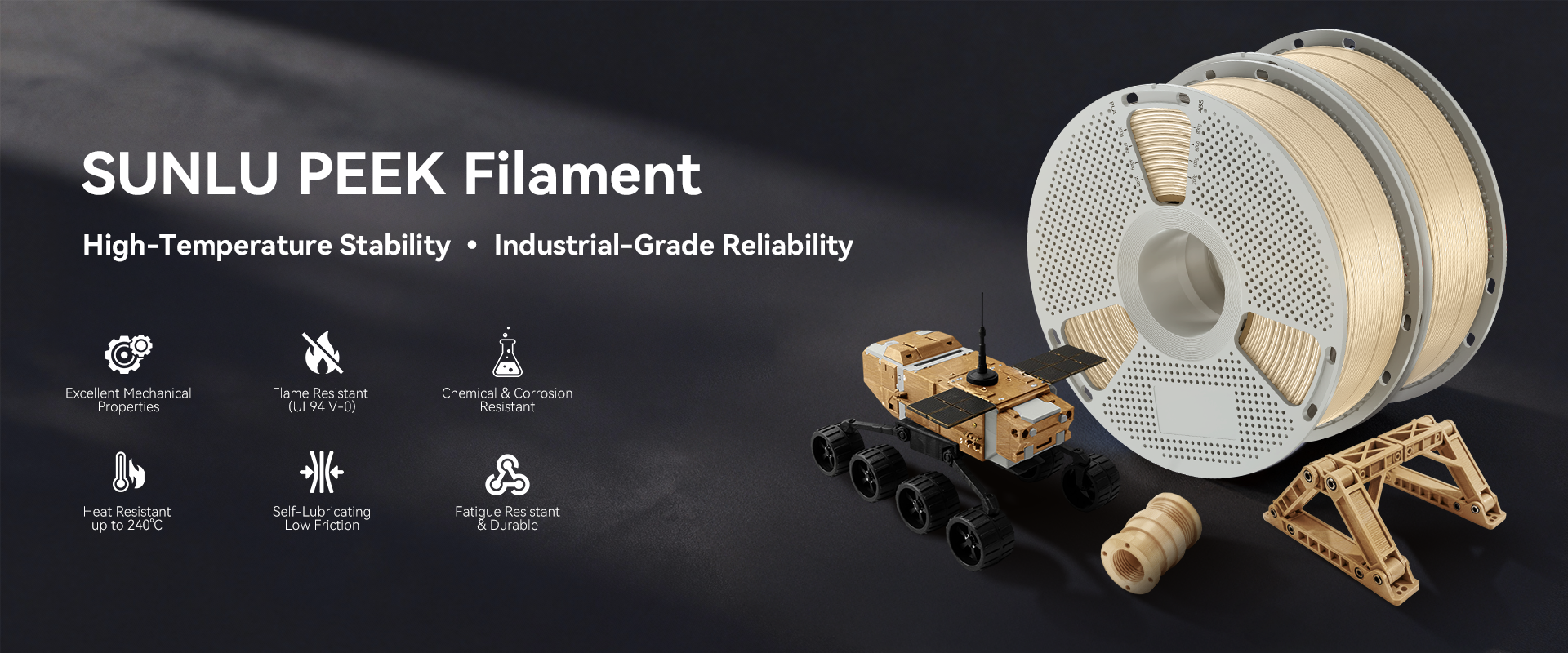 SUNLU PEEK is a premium engineering filament offering excellent heat resistance (HDT up to 147°C), high strength and toughness, superior chemical resistance, self-lubricating performance, and V0 flame retardancy. Designed for extreme industrial environments, it delivers reliable, long-term performance for high-end engineering applications.