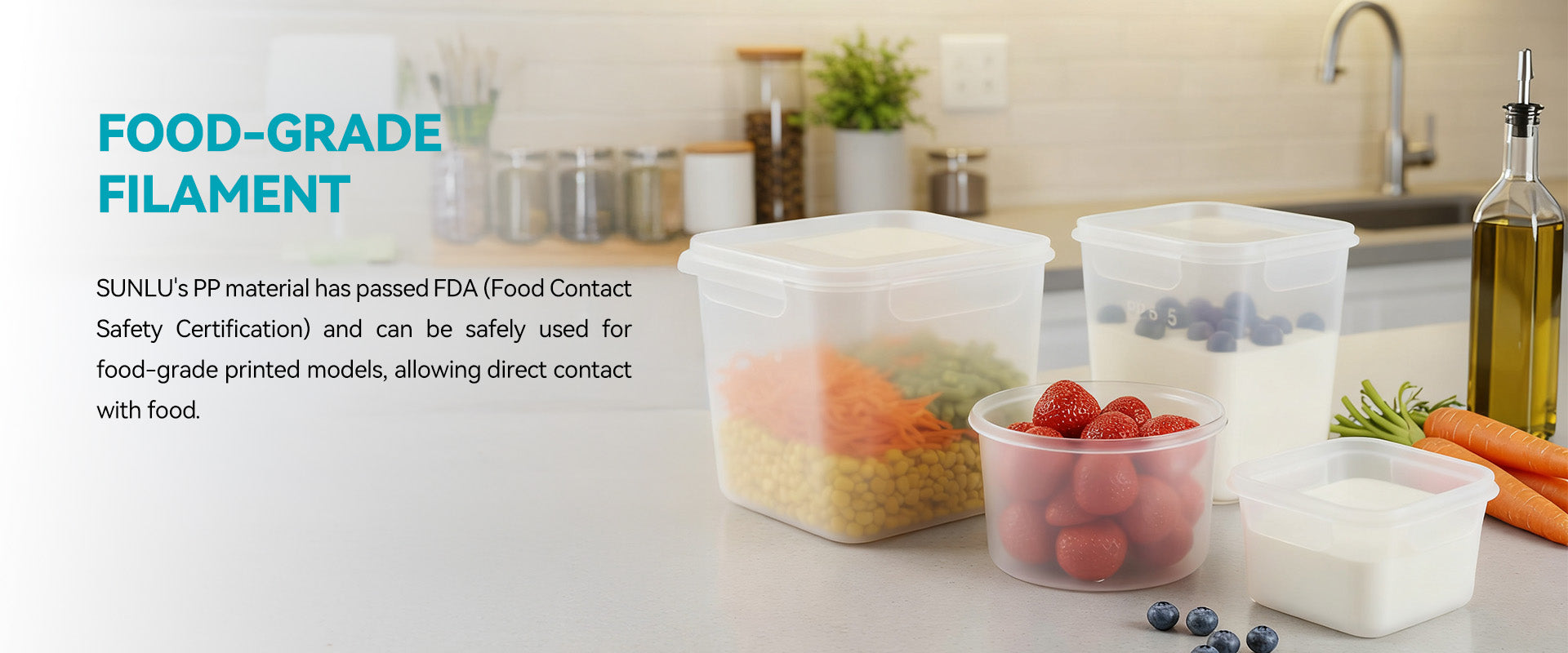 SUNLU PP filament is food-contact compliant, suitable for printing containers, kitchen tools, storage boxes, and other safe-use applications where reliability and safety are essential.